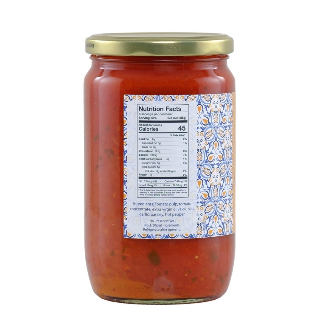 • Ingredients: Tomato pulp, tomato concentrate, extra virgin olive oil, salt, garlic, parsley, hot pepper. No preservatives. No artificial ingredients.