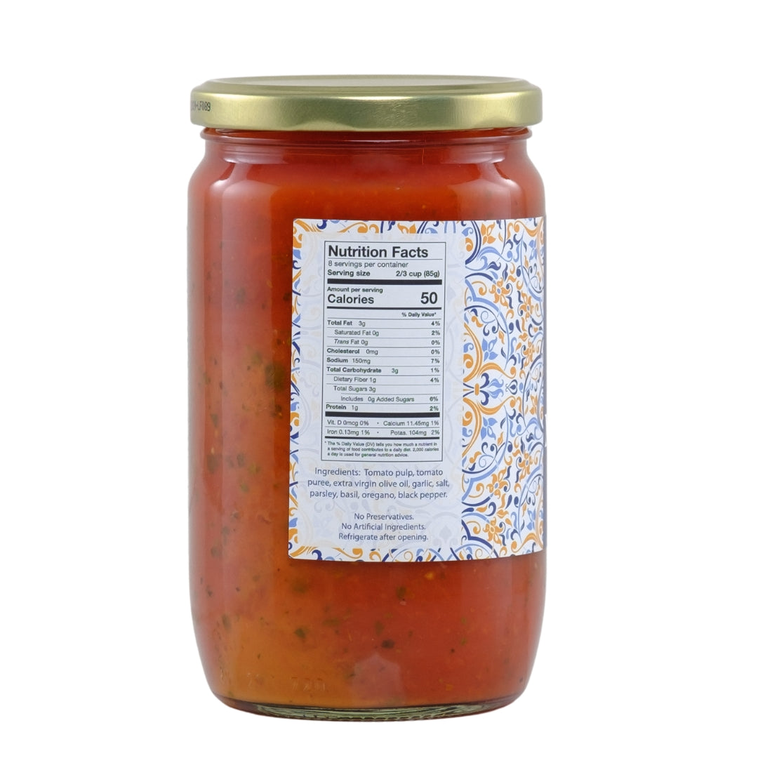 • Ingredients: Tomato pulp, tomato puree, extra virgin olive oil, garlic, salt, parsley, basil, oregano, black pepper. No preservatives. No artificial ingredients.