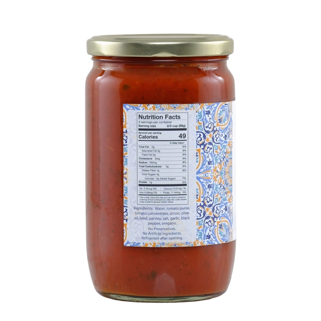 • Ingredients: Water, tomato puree, tomato concentrate, onion, olive oil, basil, parsley, salt, garlic, black pepper, oregano. No preservatives, No artificial Ingredients.